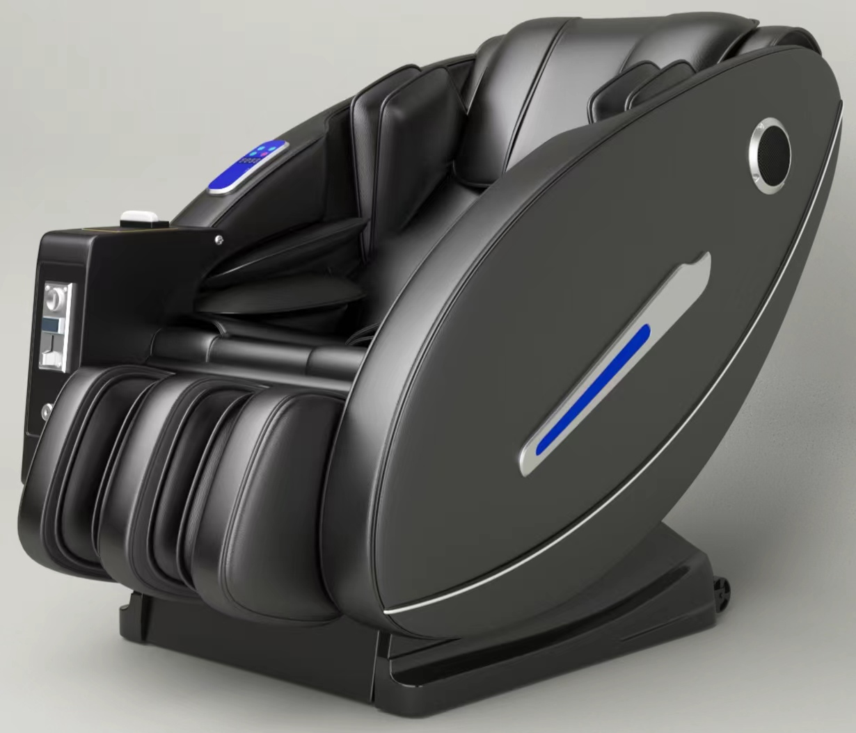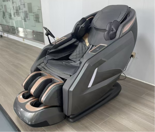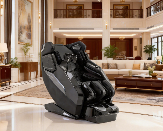 A luxurious modern living room at golden hour sunset, a sleek black zero-gravity massage chair in the center with soft ambient lighting.