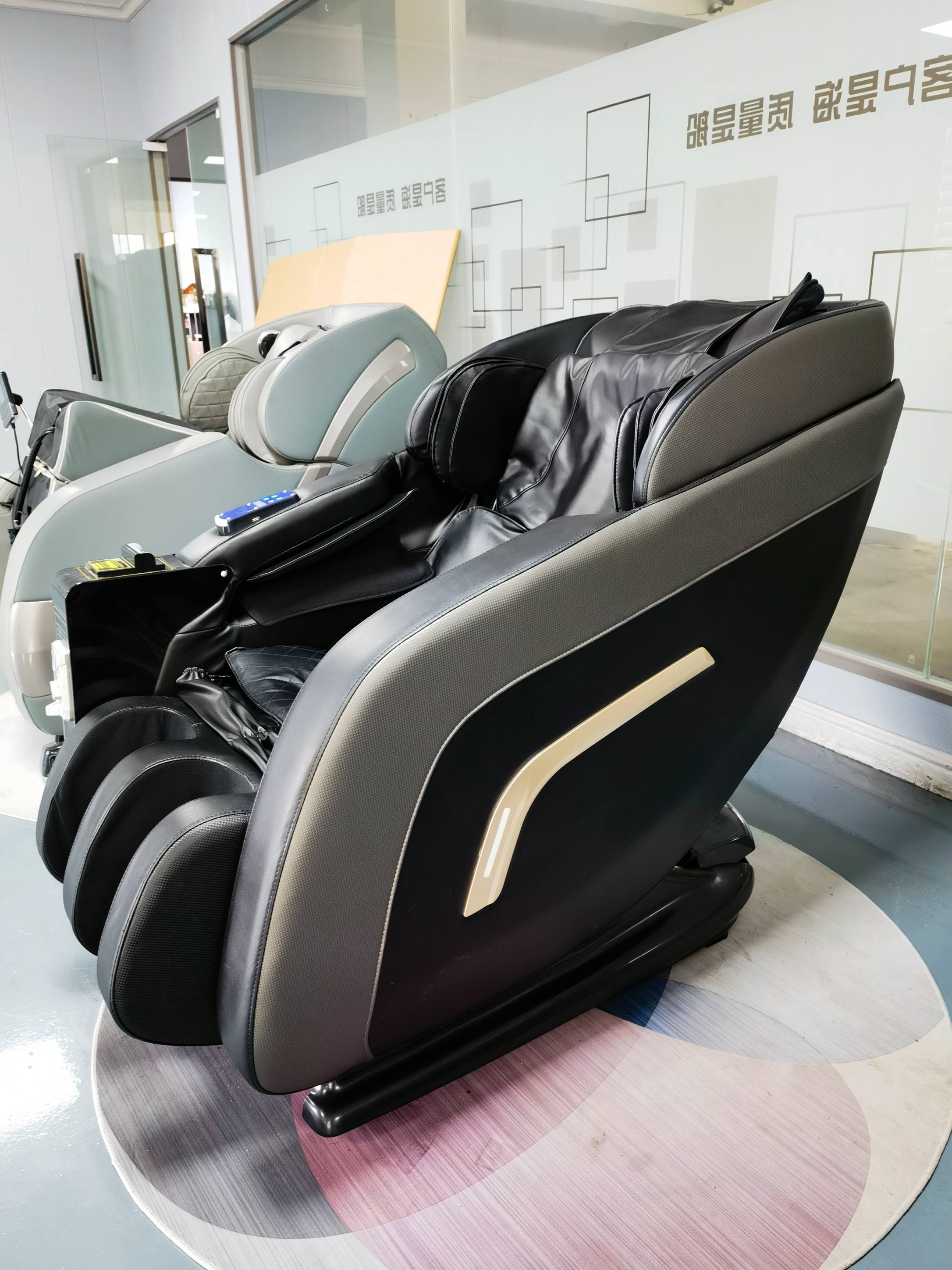 Upscale commercial scene inside a modern shopping mall atrium or airport lounge at dusk, with warm ambient lighting and city views through large windows. A cluster of high-end shared massage chairs